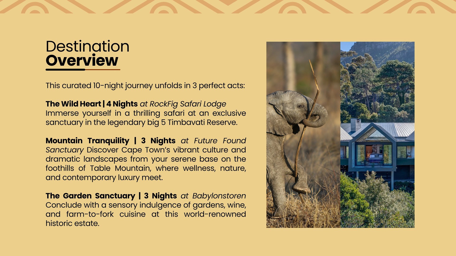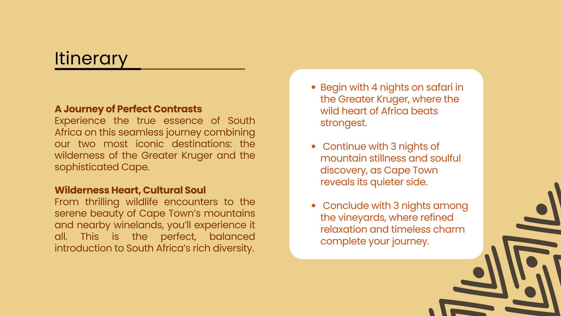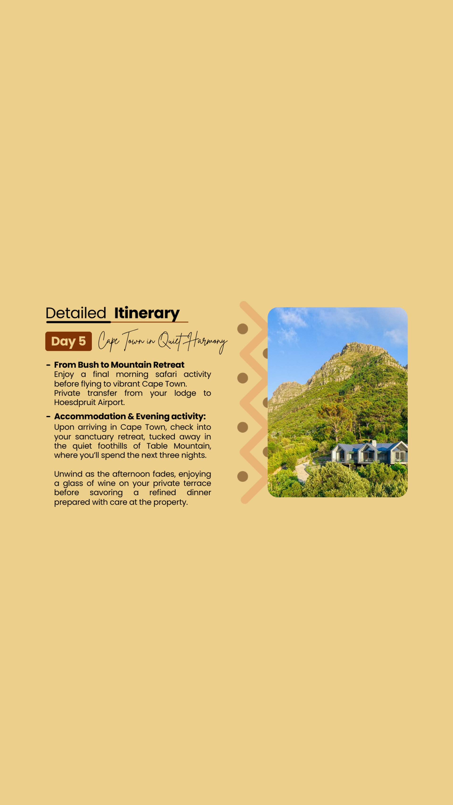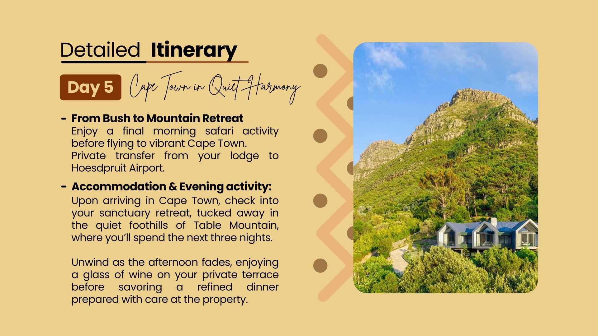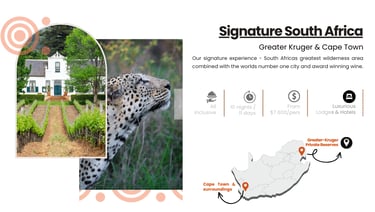 This is a journey of beautiful contrasts - from the profound stillness of the bush and the thrill of wildlife encounters, to the vibrant energy of Cape Town and the refined tastes of its winelands. By blending raw, natural adventure with sophisticated culture and scenery, this package offers a rich, balanced, and deeply memorable perspective on South Africa.