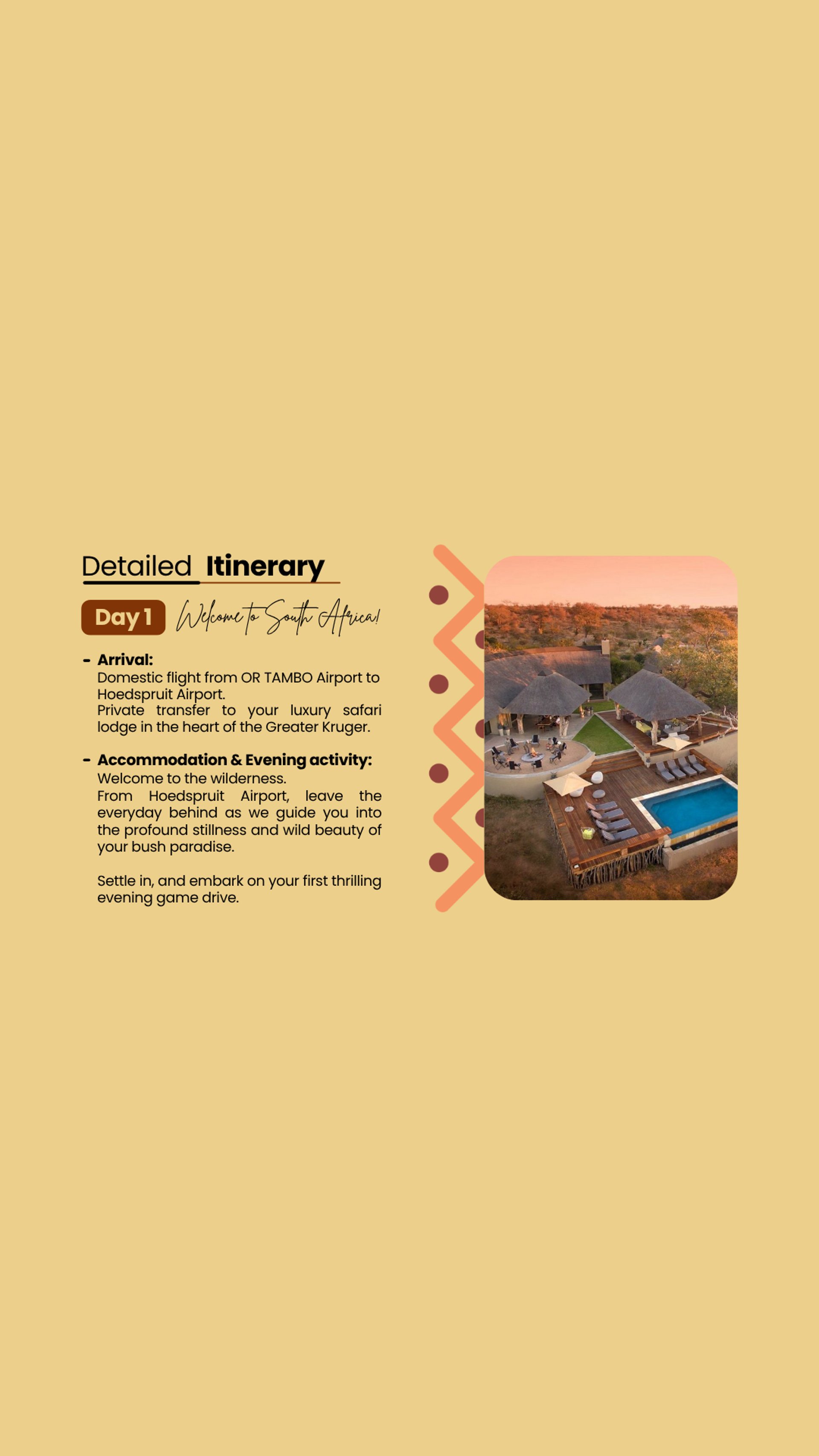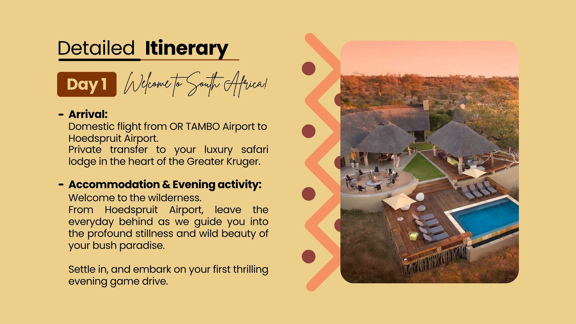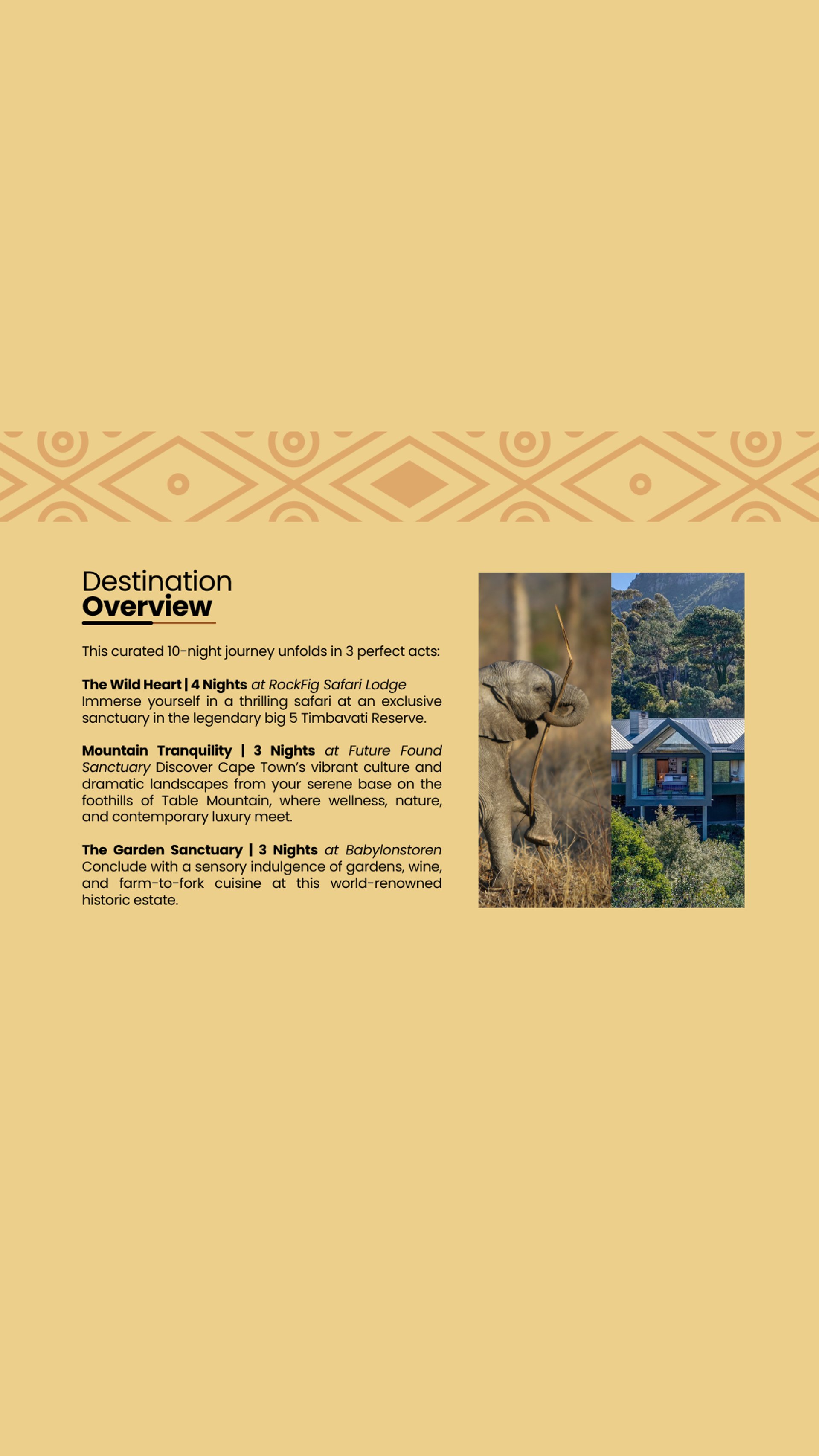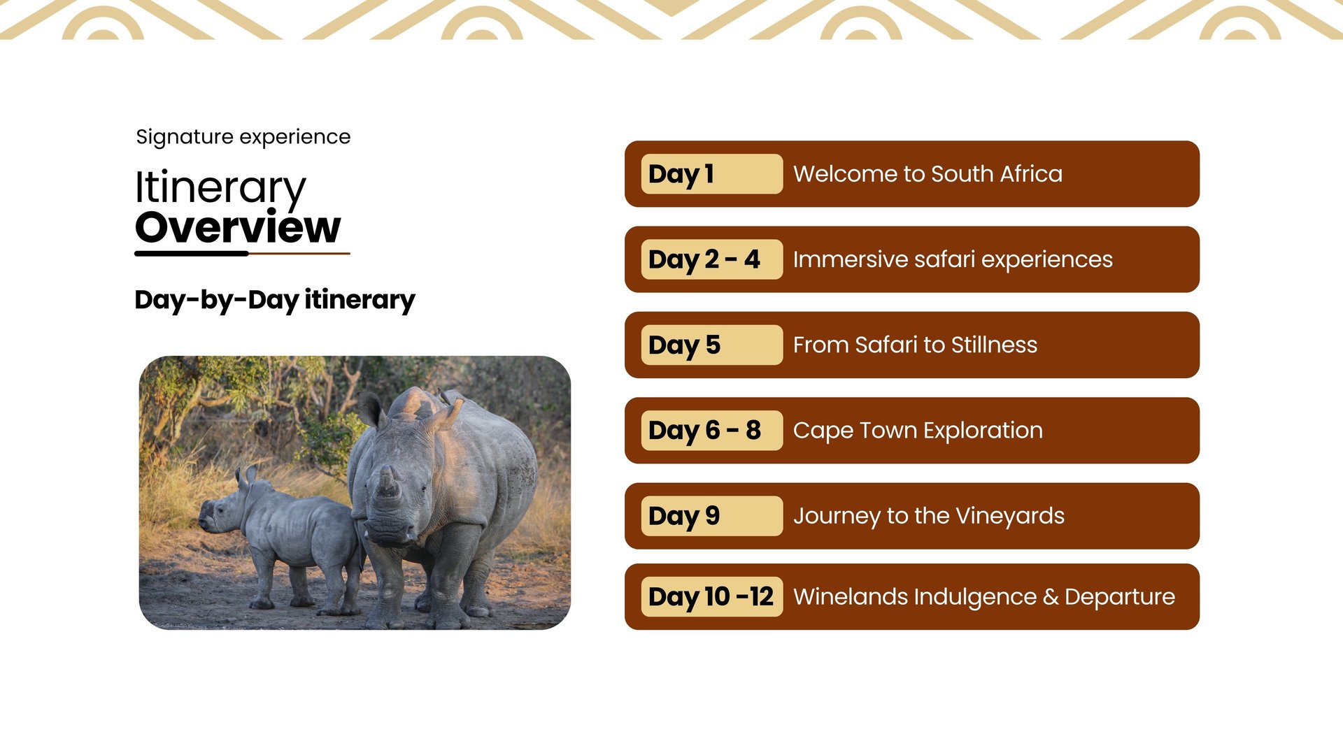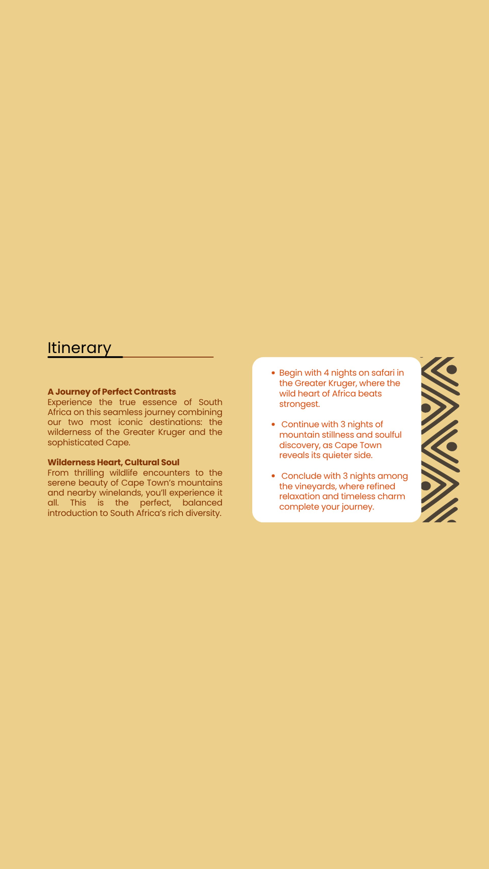 This is a journey of beautiful contrasts - from the profound stillness of the bush and the thrill of wildlife encounters, to the vibrant energy of Cape Town and the refined tastes of its winelands. By blending raw, natural adventure with sophisticated culture and scenery, this package offers a rich, balanced, and deeply memorable perspective on South Africa.