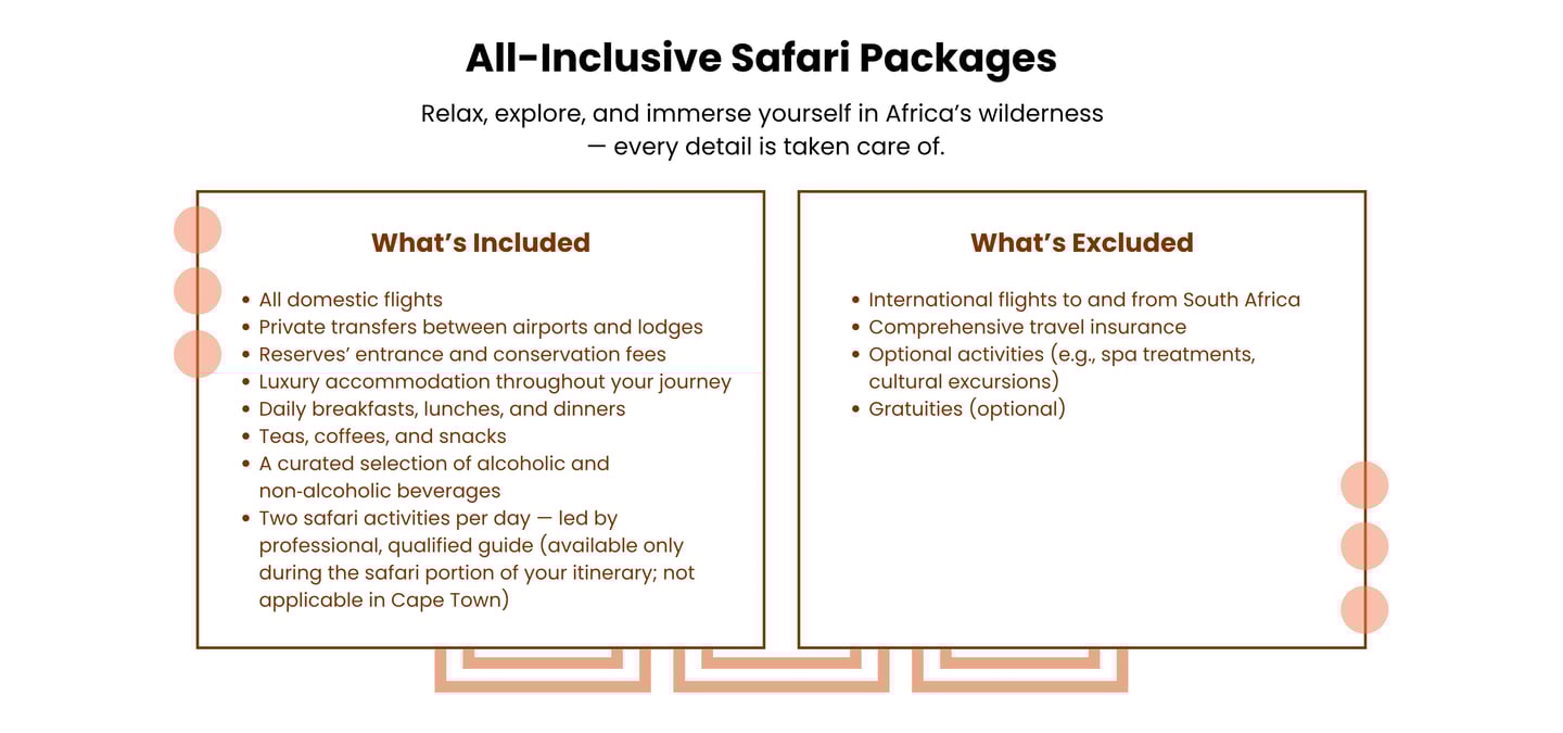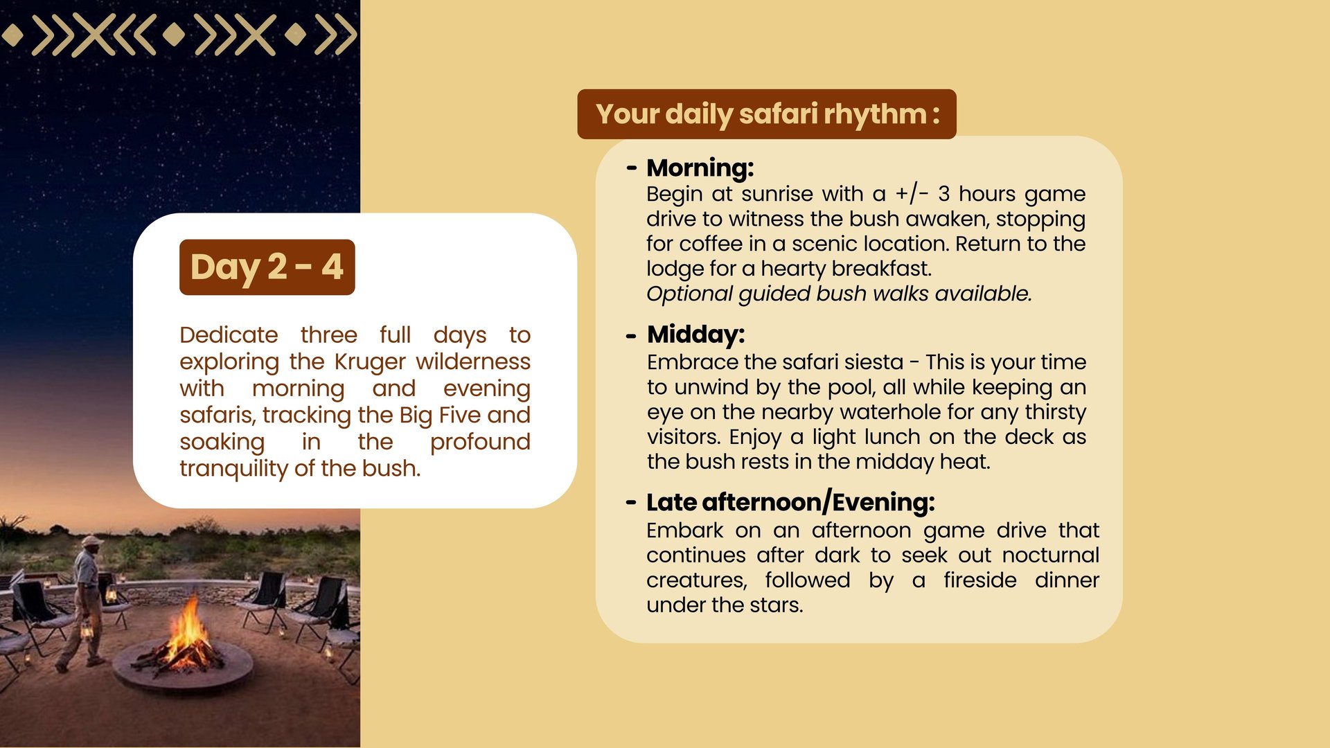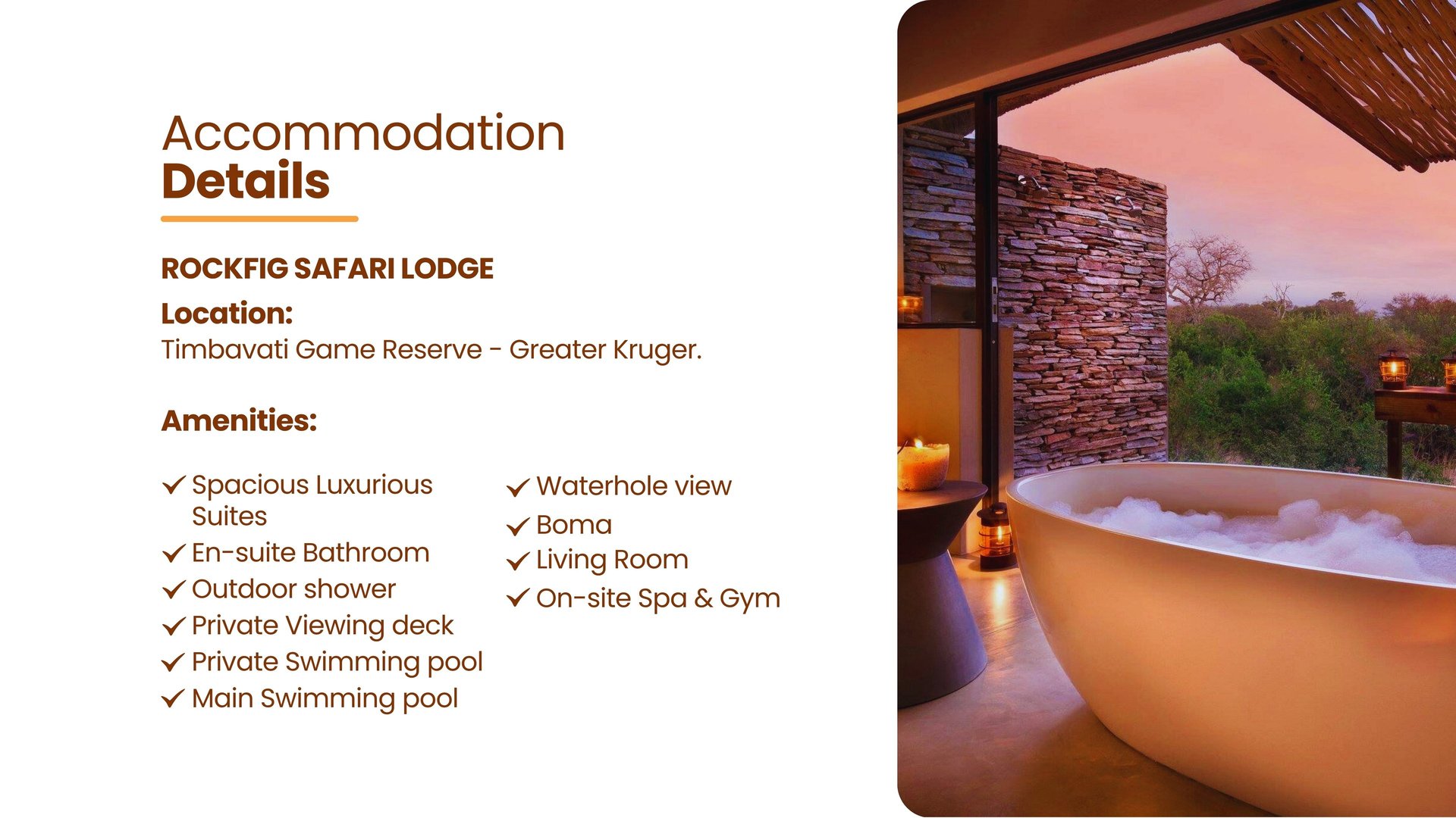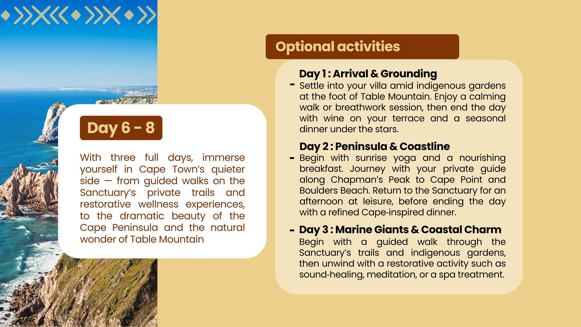This is a journey of beautiful contrasts - from the profound stillness of the bush and the thrill of wildlife encounters, to the vibrant energy of Cape Town and the refined tastes of its winelands. By blending raw, natural adventure with sophisticated culture and scenery, this package offers a rich, balanced, and deeply memorable perspective on South Africa.