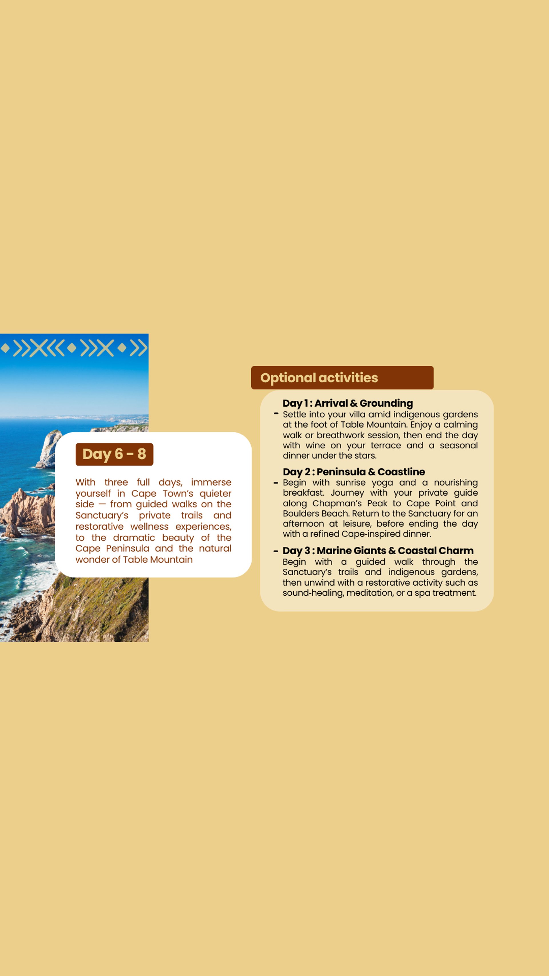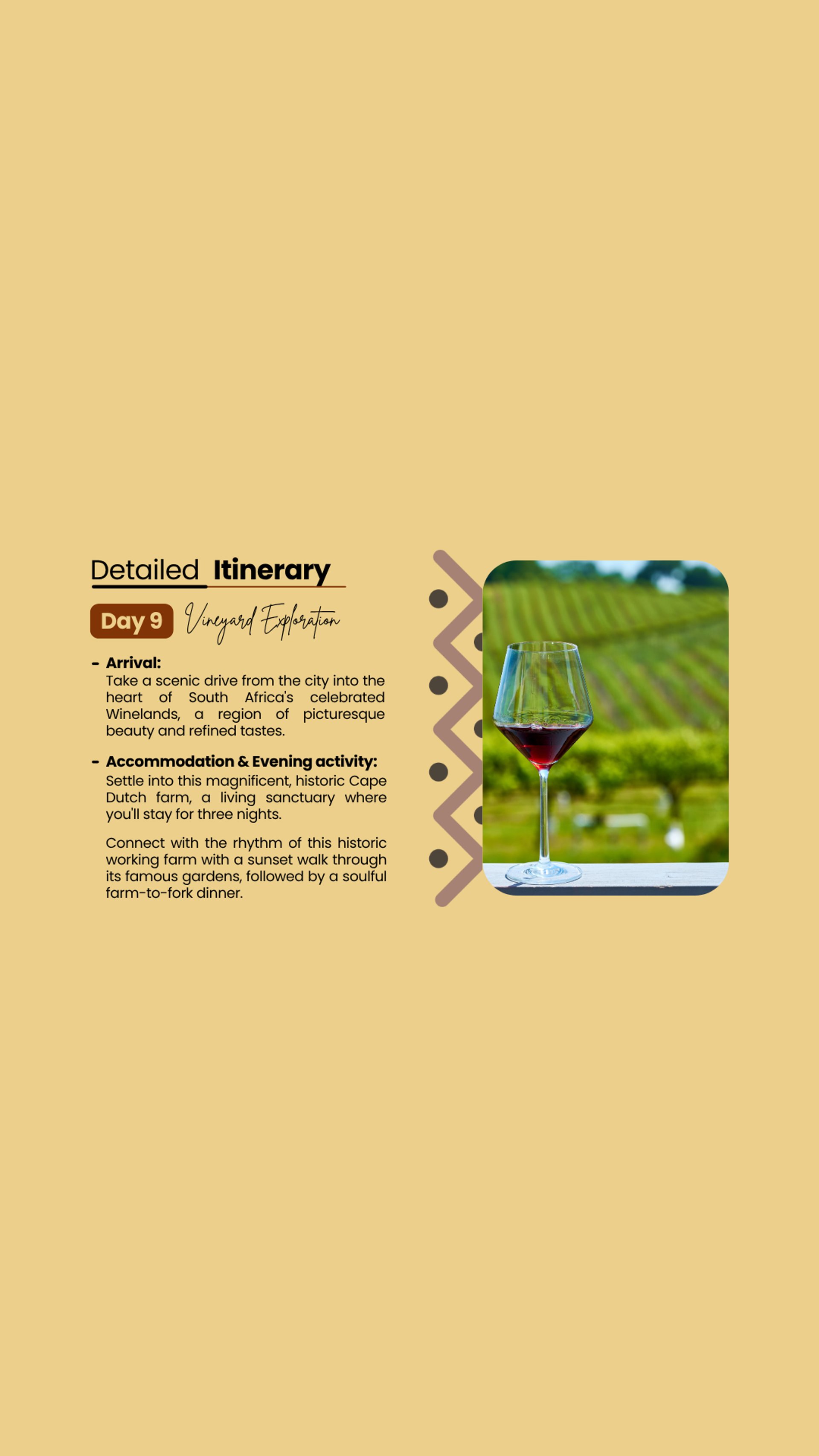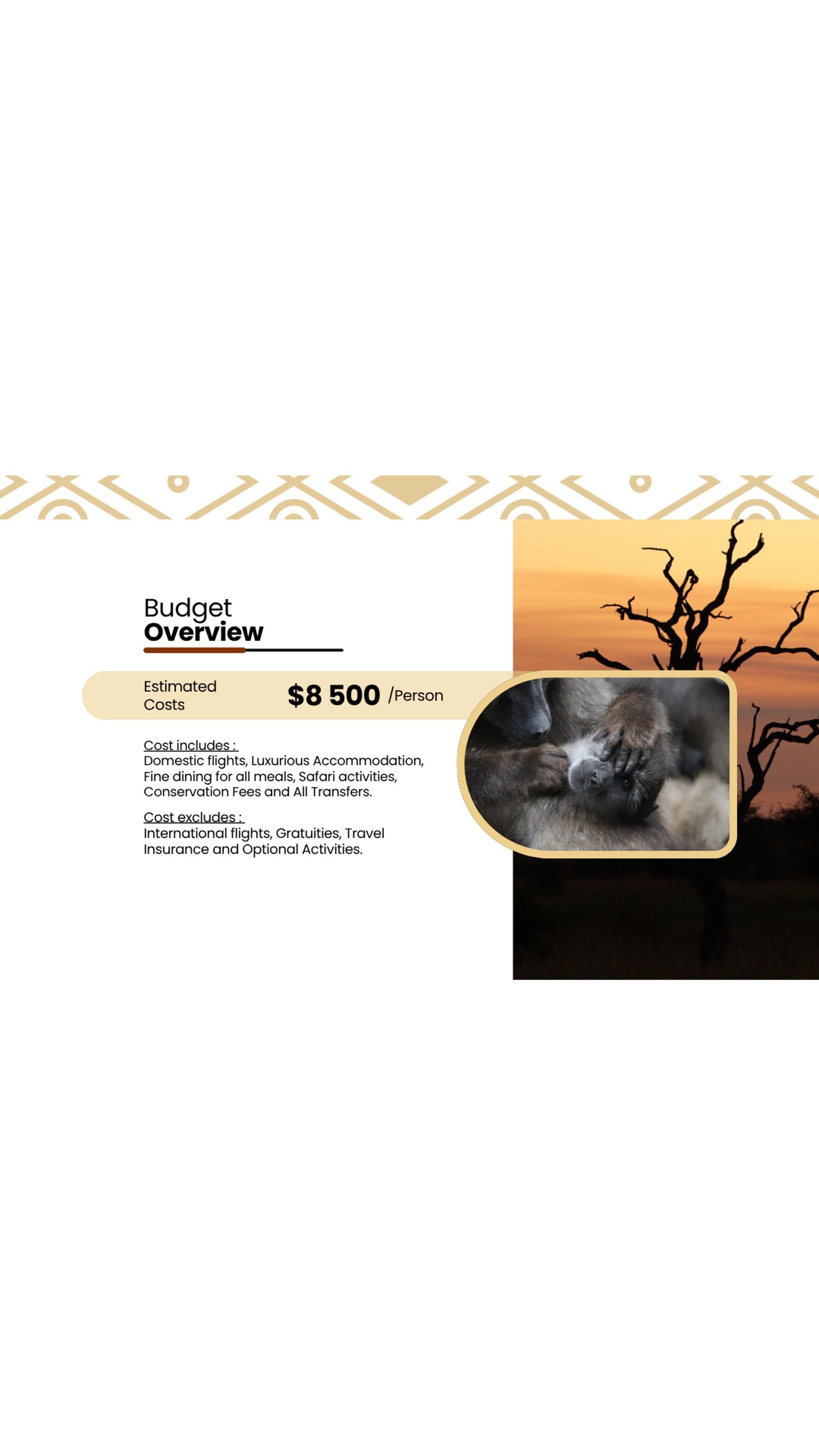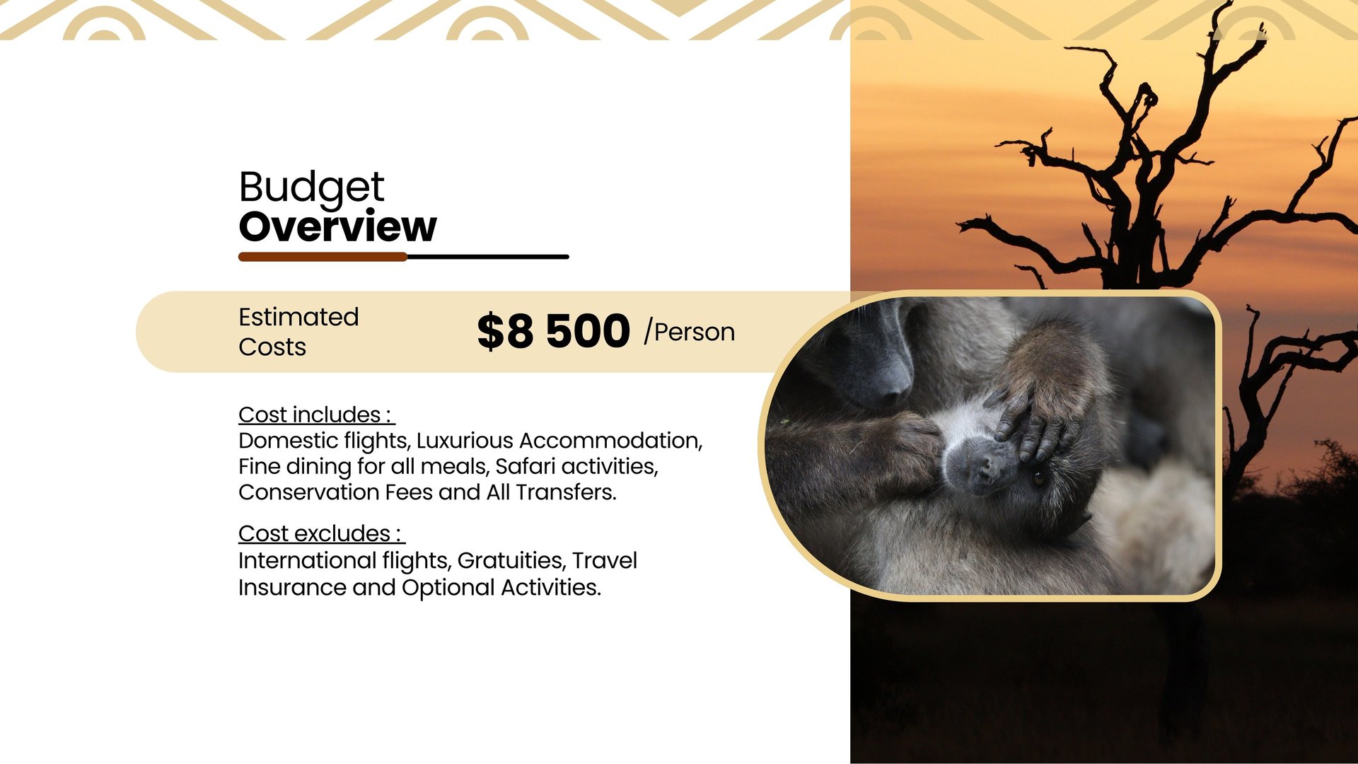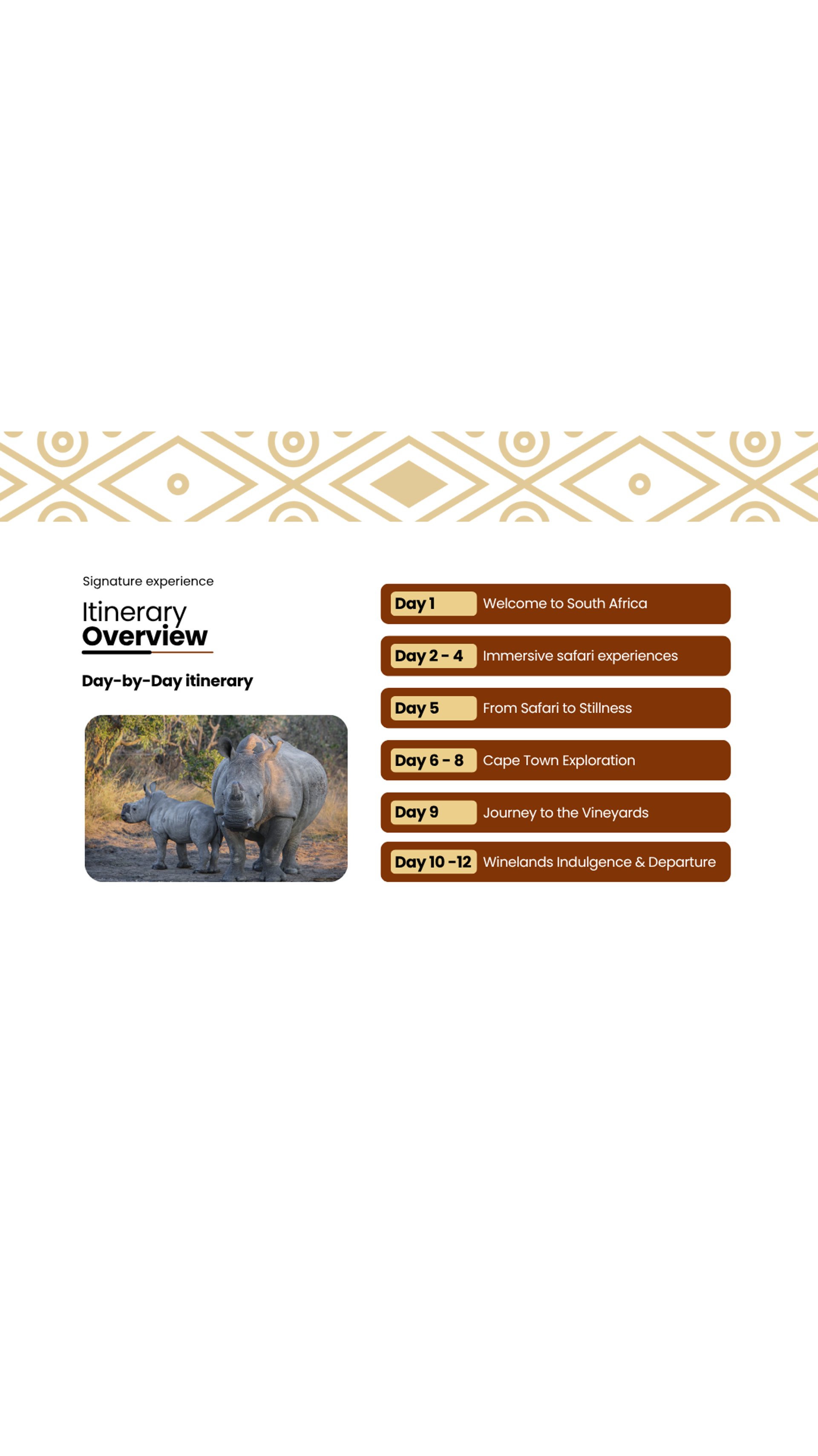 This is a journey of beautiful contrasts - from the profound stillness of the bush and the thrill of wildlife encounters, to the vibrant energy of Cape Town and the refined tastes of its winelands. By blending raw, natural adventure with sophisticated culture and scenery, this package offers a rich, balanced, and deeply memorable perspective on South Africa.