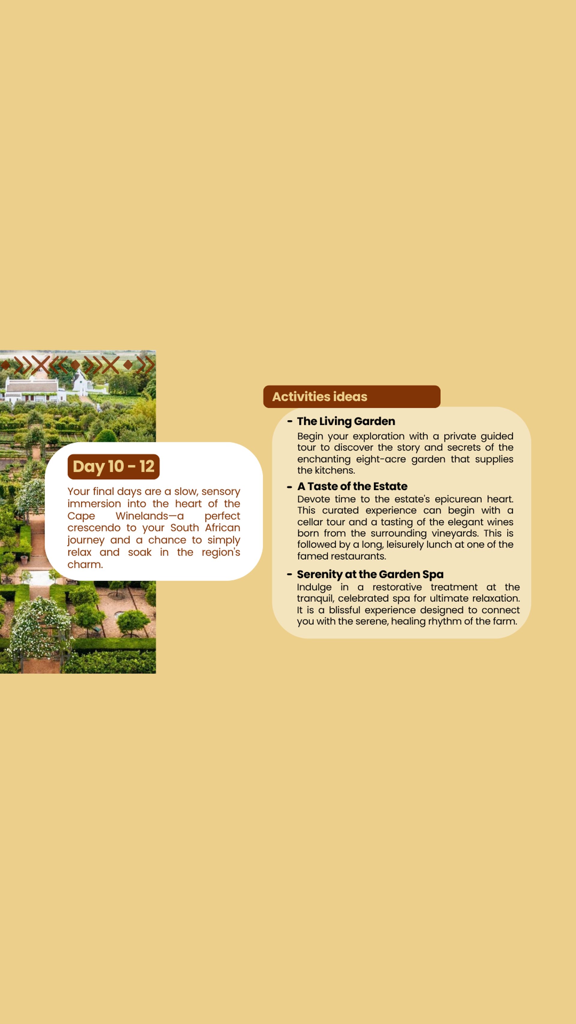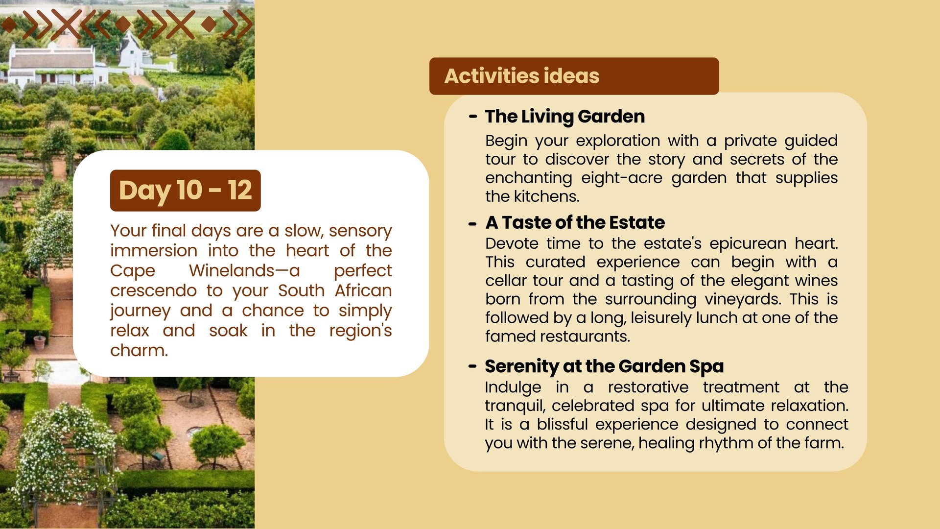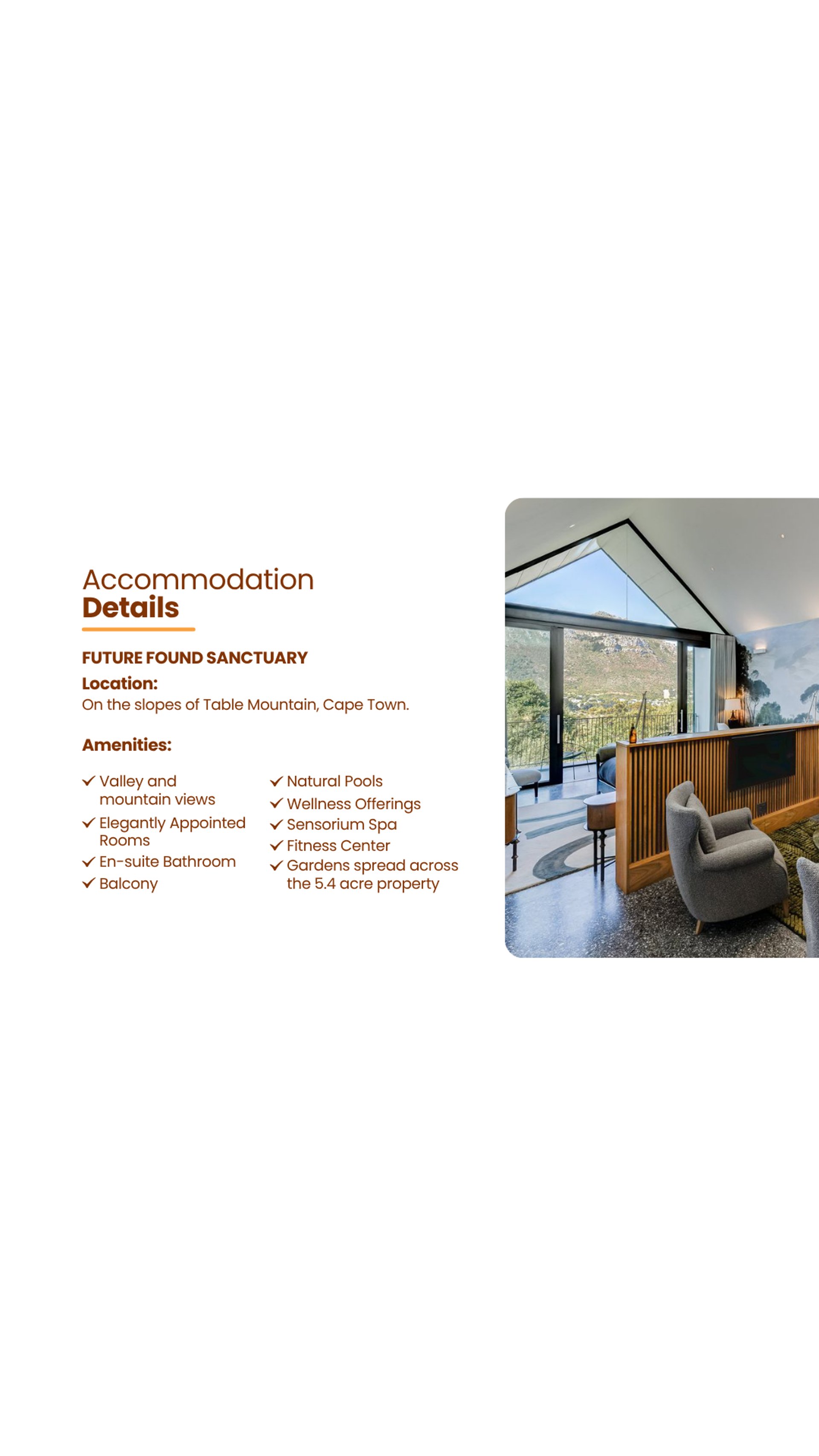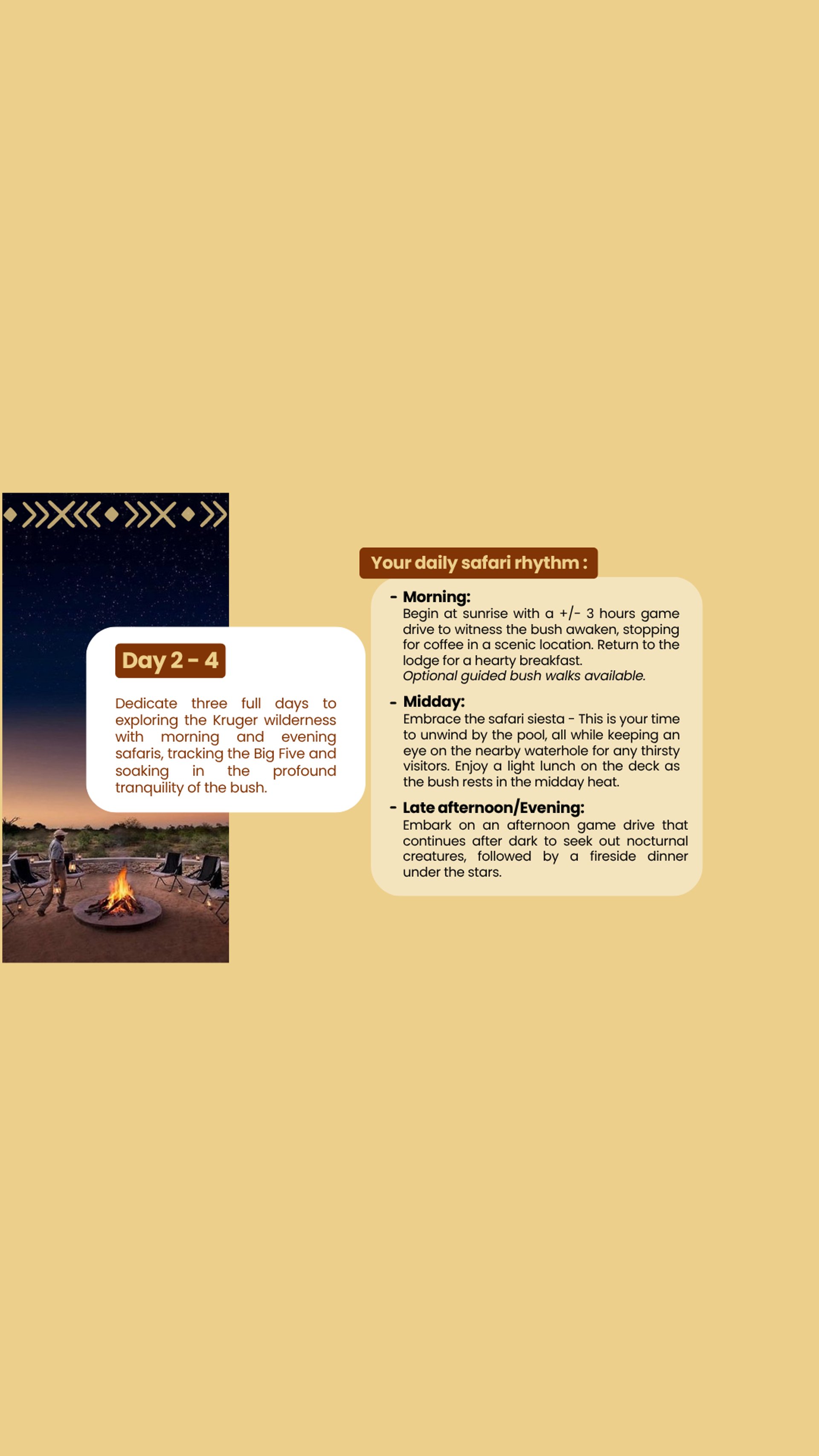 This is a journey of beautiful contrasts - from the profound stillness of the bush and the thrill of wildlife encounters, to the vibrant energy of Cape Town and the refined tastes of its winelands. By blending raw, natural adventure with sophisticated culture and scenery, this package offers a rich, balanced, and deeply memorable perspective on South Africa.